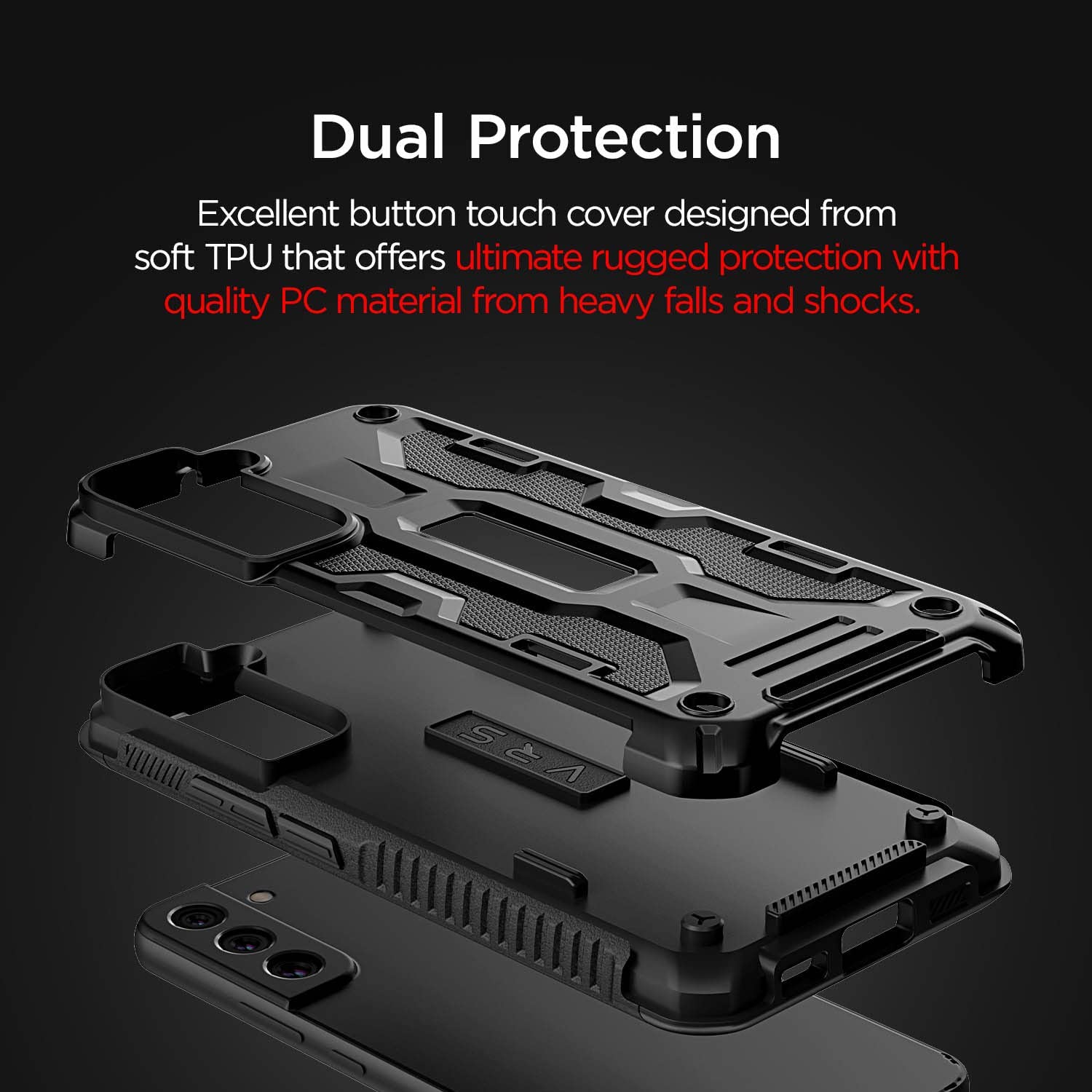 Galaxy S22+ users who may want a rugged exterior and an industrial design can refer to the VRS Design Terra Guard. It protects the phone from heavy falls and shocks, and it works with wireless chargers, despite the thick armor-like design.
