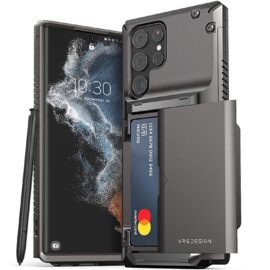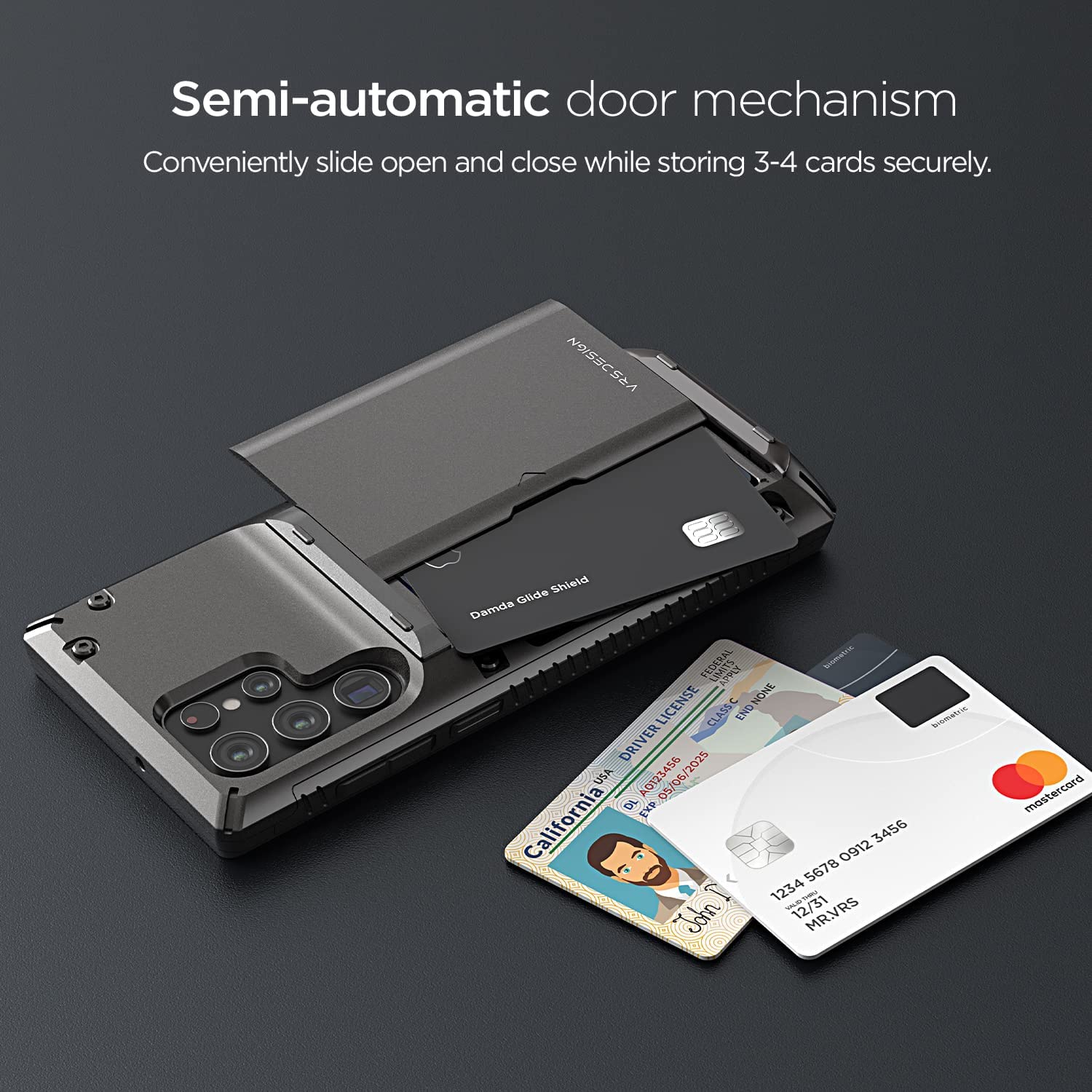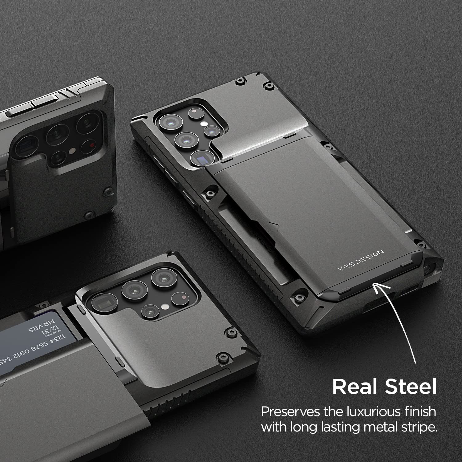 We're closing the list with a couple of cases that feature a more industrial design. First is the VRS Design Damda Glide Pro. It boasts a metal base bar for extreme drop protection and a body made of high-quality TPU. The back panel is equipped with a smooth semi-automatic sliding mechanism that reveals a holster for credit cards. It's available in black or matte black.