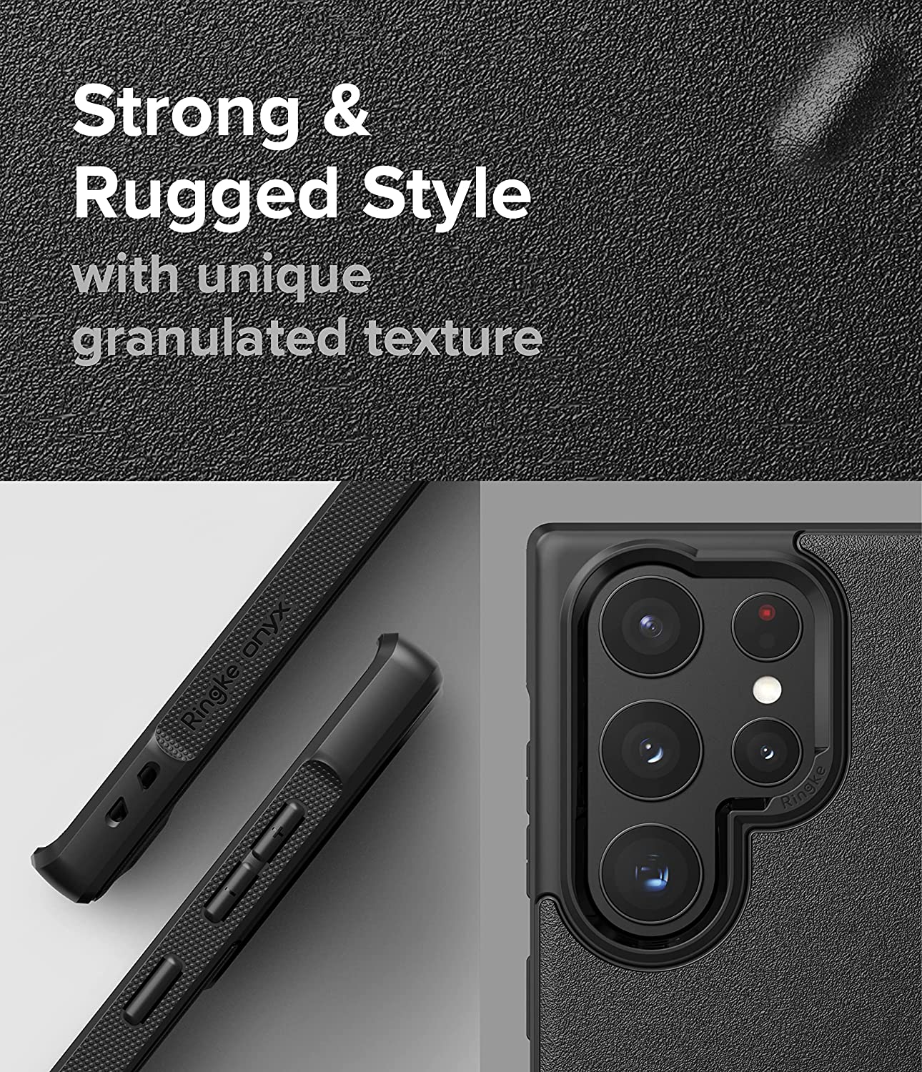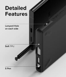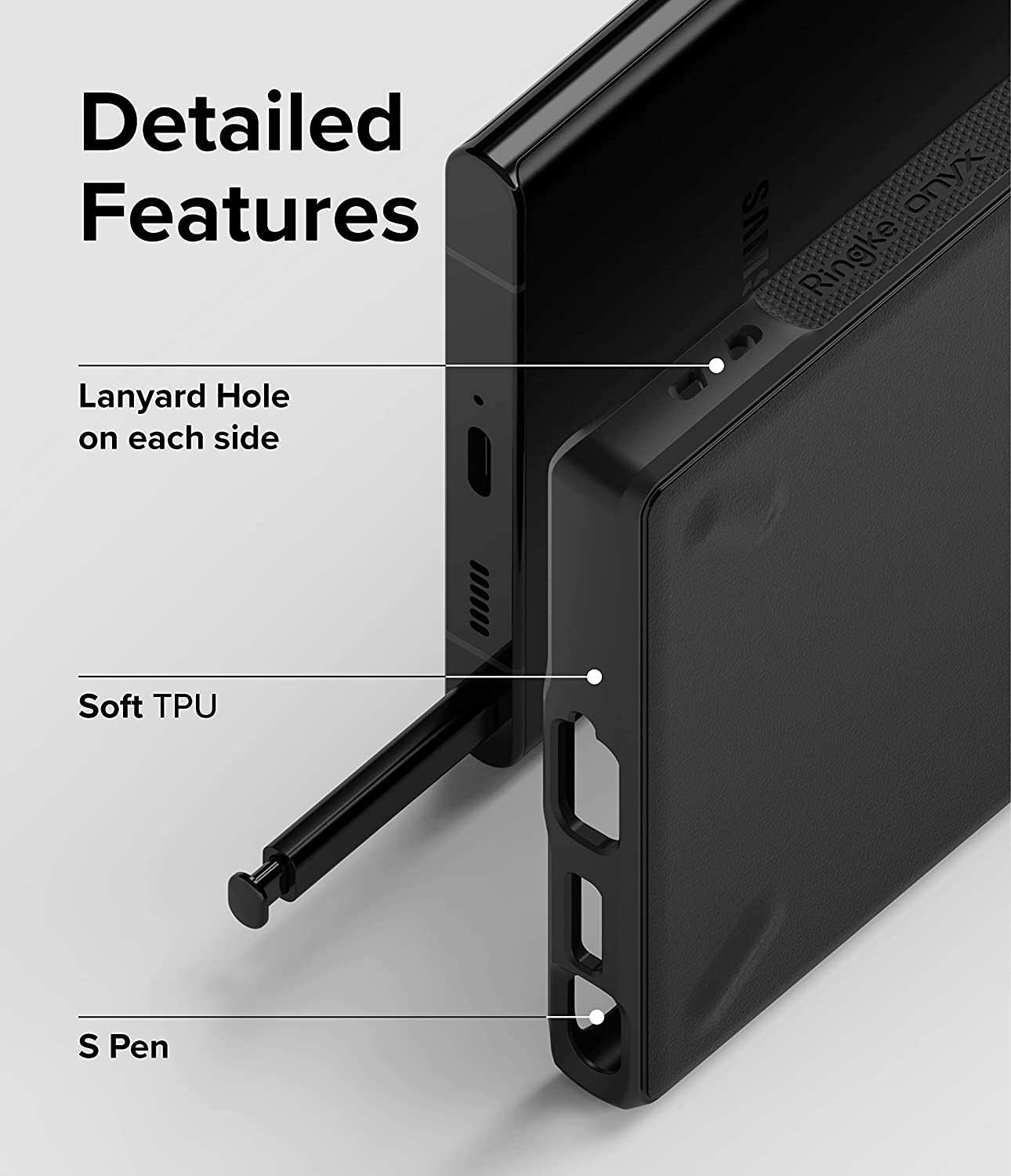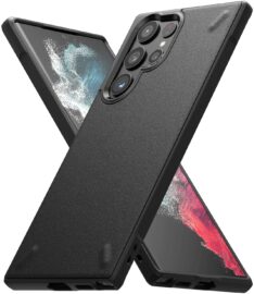 Onwards to third-party Galaxy S22 Ultra cases, starting with the Ringke Onyx. This case combines a slim-fit design with a heavy-duty non-slip TPU and has a fingerprint-resistant, anti-skid granulate texture on the back panel, along with grippy edges. It's available in black, dark gray, and navy colors.