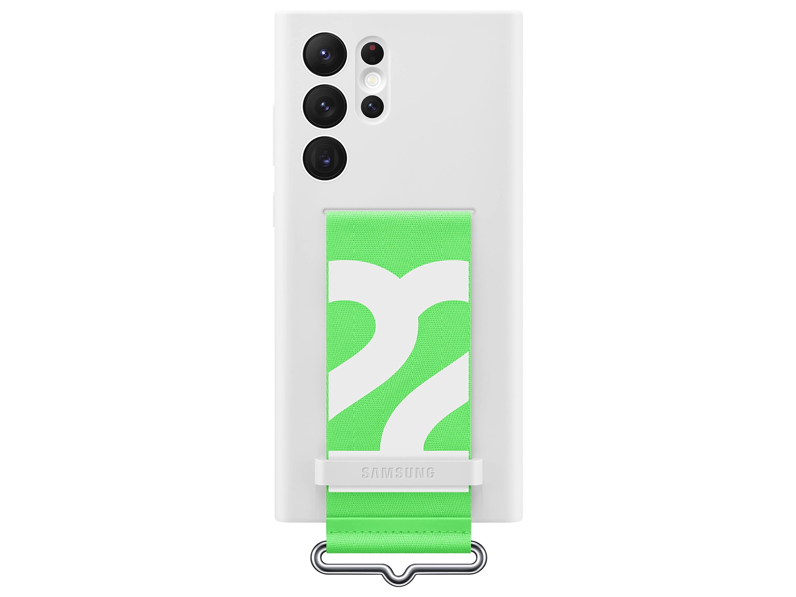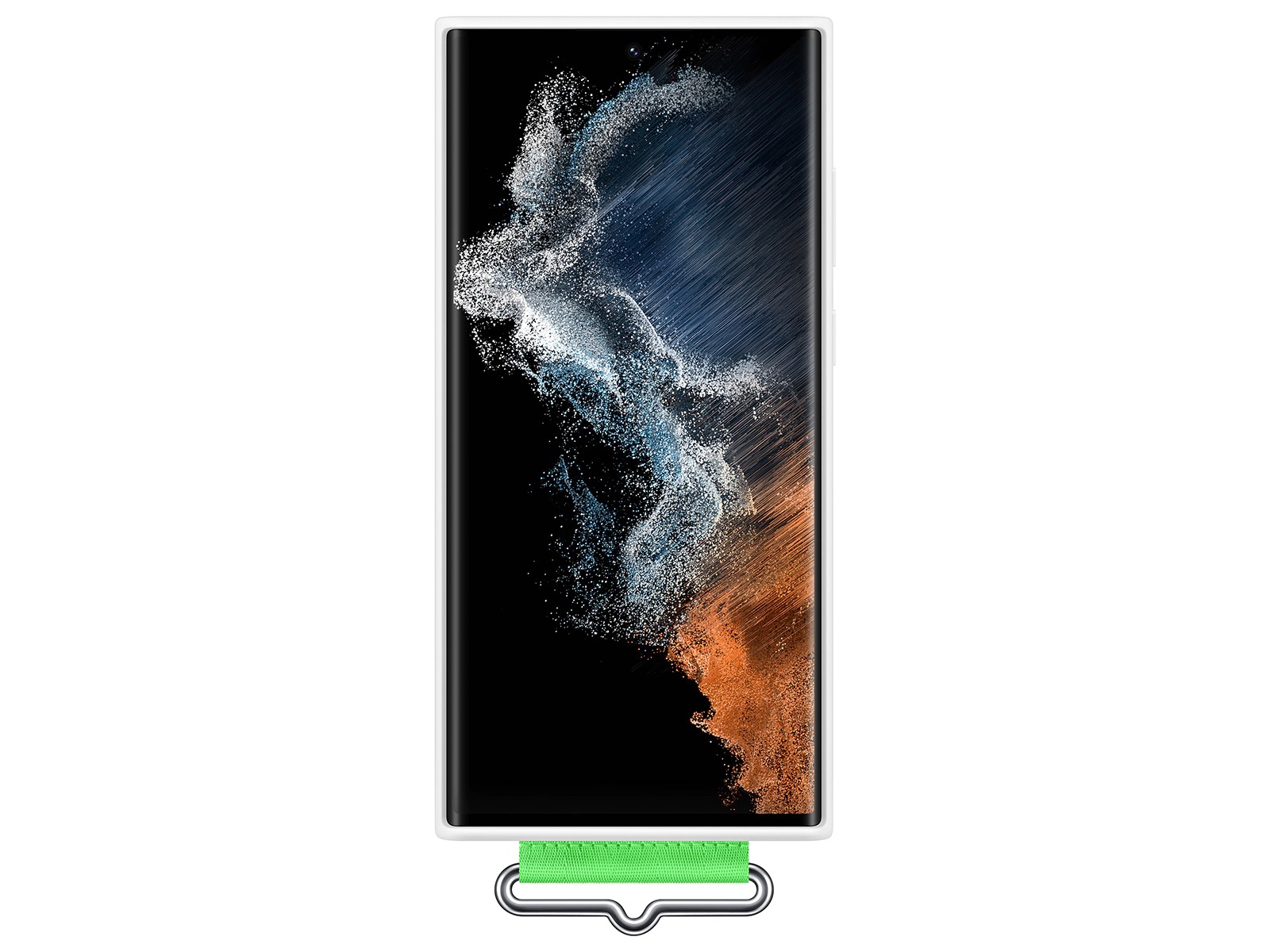 The Samsung Silicone Cover with Strap is true to its description. It's a silicone cover available in two color options — navy and white — featuring an orange or mint green nylon strap with a keyring at one end. The strap is detachable, which offers a way to personalize your device.