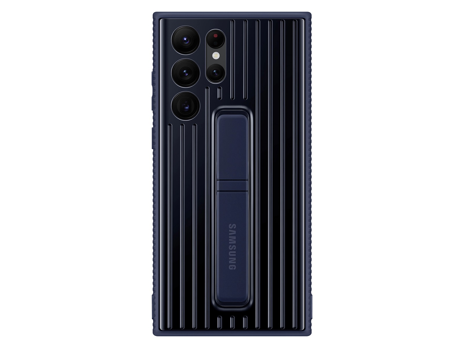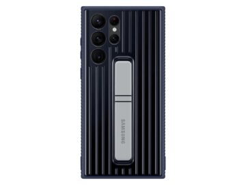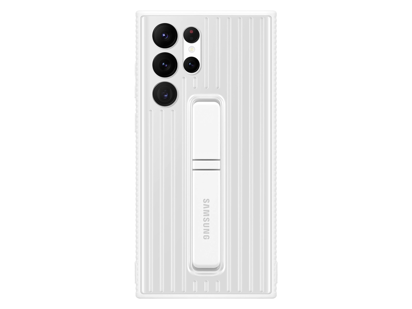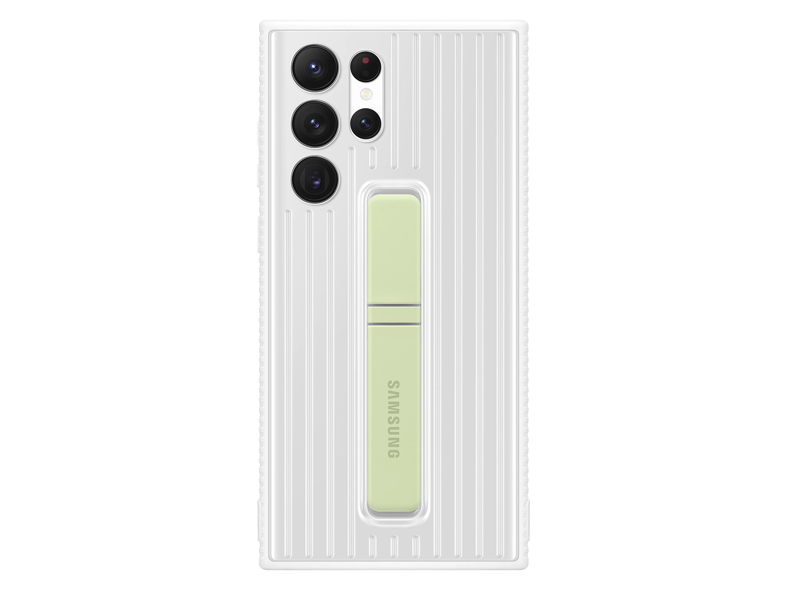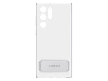 The Clear Standing Cover has a hybrid TPU (Thermoplastic Polyurethane) and PC (Polycarbonate) build. The TPU soft bumpers protect the corners of the Galaxy S22 Ultra, and the solid PC back panel keeps the Victus+ glass both visible and protected. The case has a clear finish that lets all four official colors shine through. It also features a silver kickstand with the Samsung logo on it.