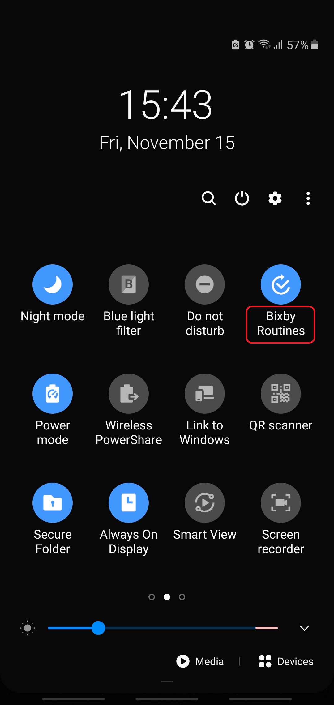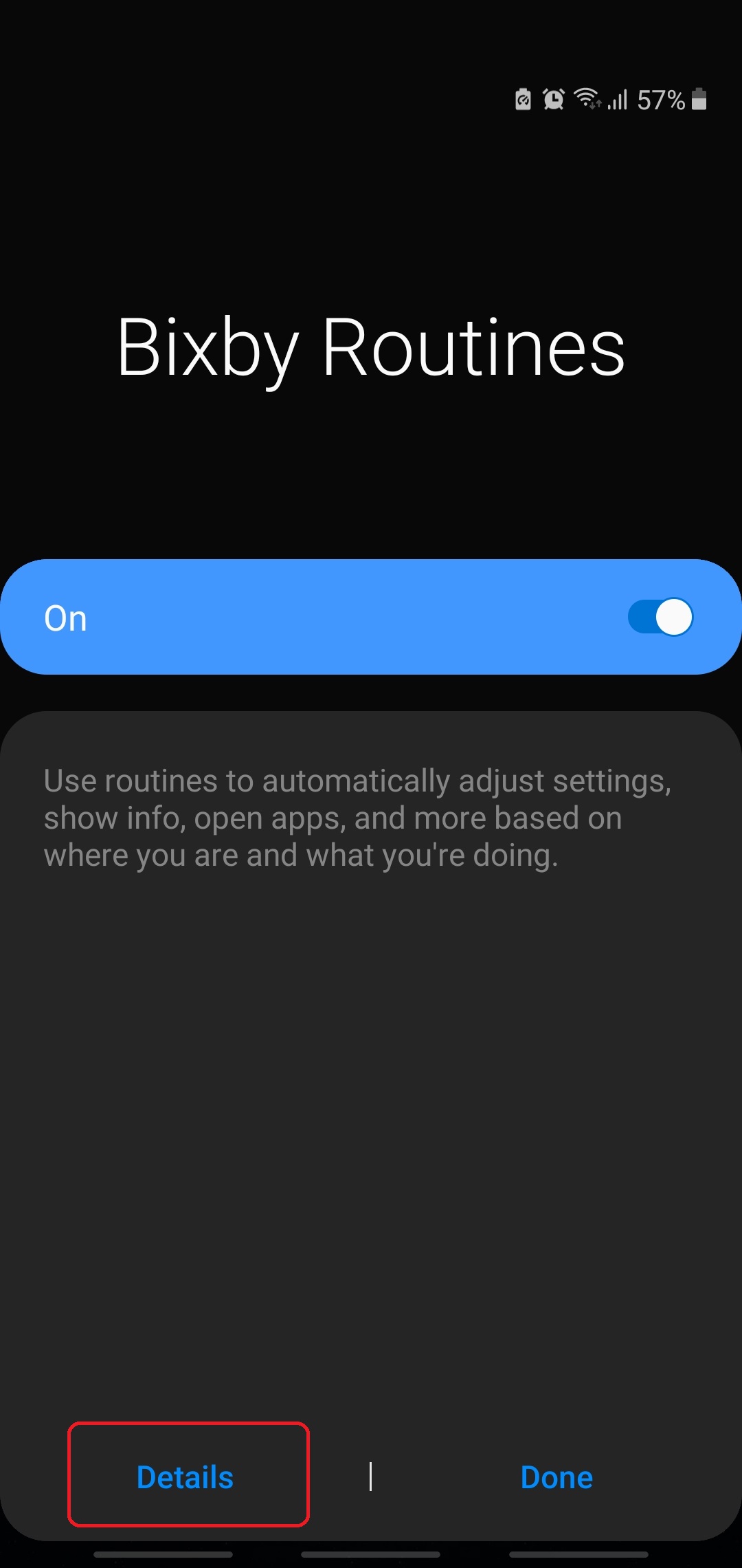 There are a couple of ways to access Bixby Routines. One is to open Settings and go to Advanced Features. The other is to swipe the status bar down and tap the Bixby Routines quick toggle (the text, not the toggle itself) and then tap Details.