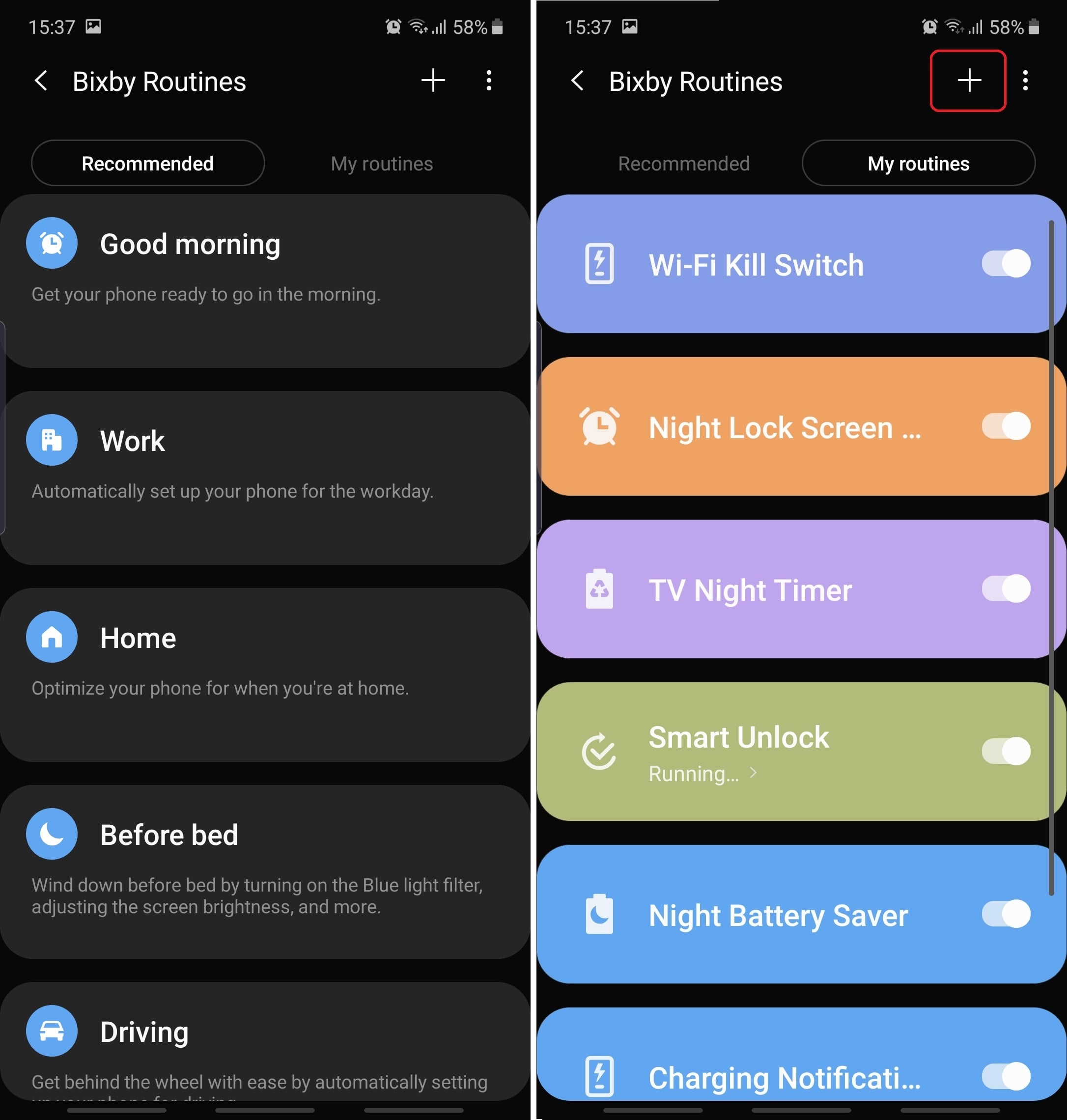 Once inside Bixby Routines, you can either choose one of the existing presets from the Recommended section and fill out the empty fields, or you can begin creating your own Bixby Routine from scratch by tapping ‘+' in the upper right corner of My Routines.