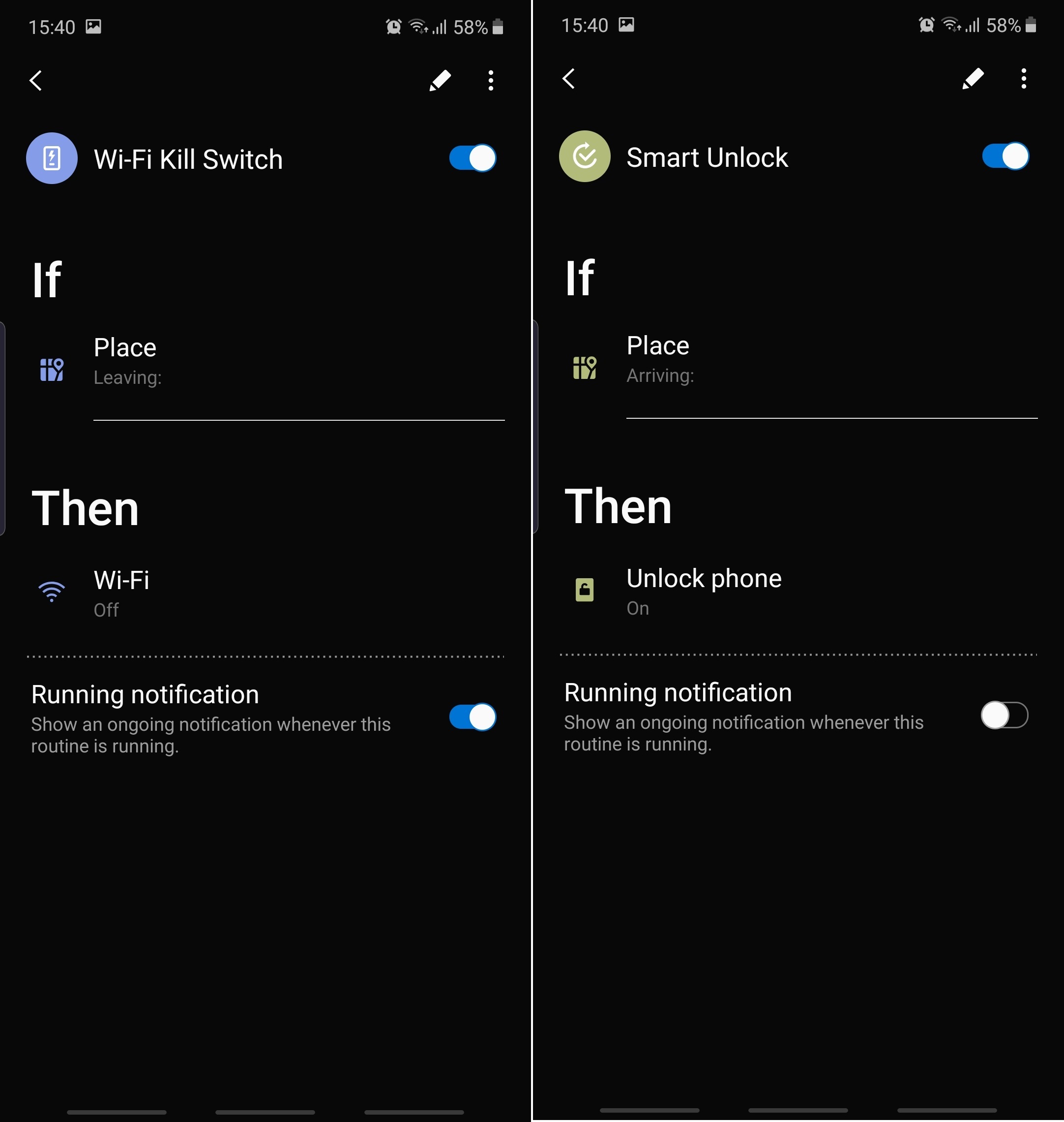 Speaking of location-based Routines, you can create a Wi-Fi kill switch to have Wi-Fi automatically turned off whenever you leave a predefined location. Or you can create a Routine as an alternative to Google's Smart Lock and Trusted Places, whereby your phone remains unlocked while you're at home.