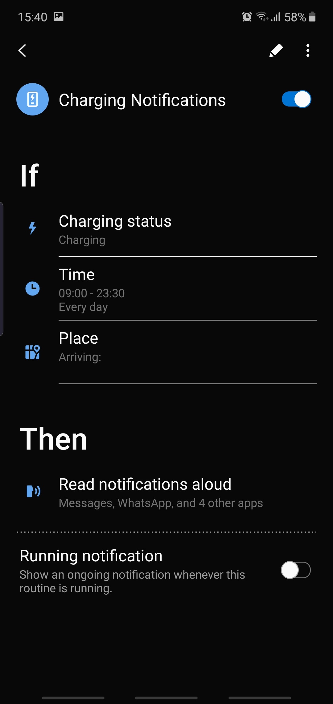 Another useful Routine can read your notifications out loud whenever your phone is charging, as long as you're in the privacy of your home. You can avoid loud notifications while charging your phone at night by setting a specific time window for when the Routine should be active.
