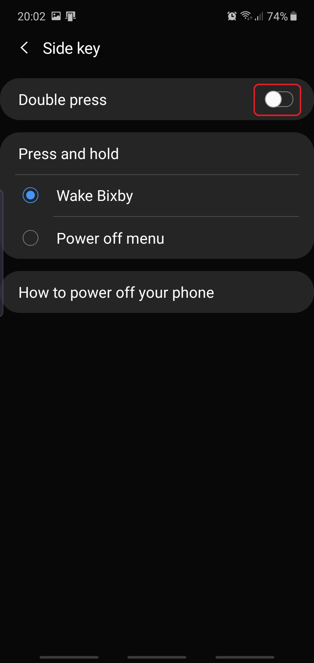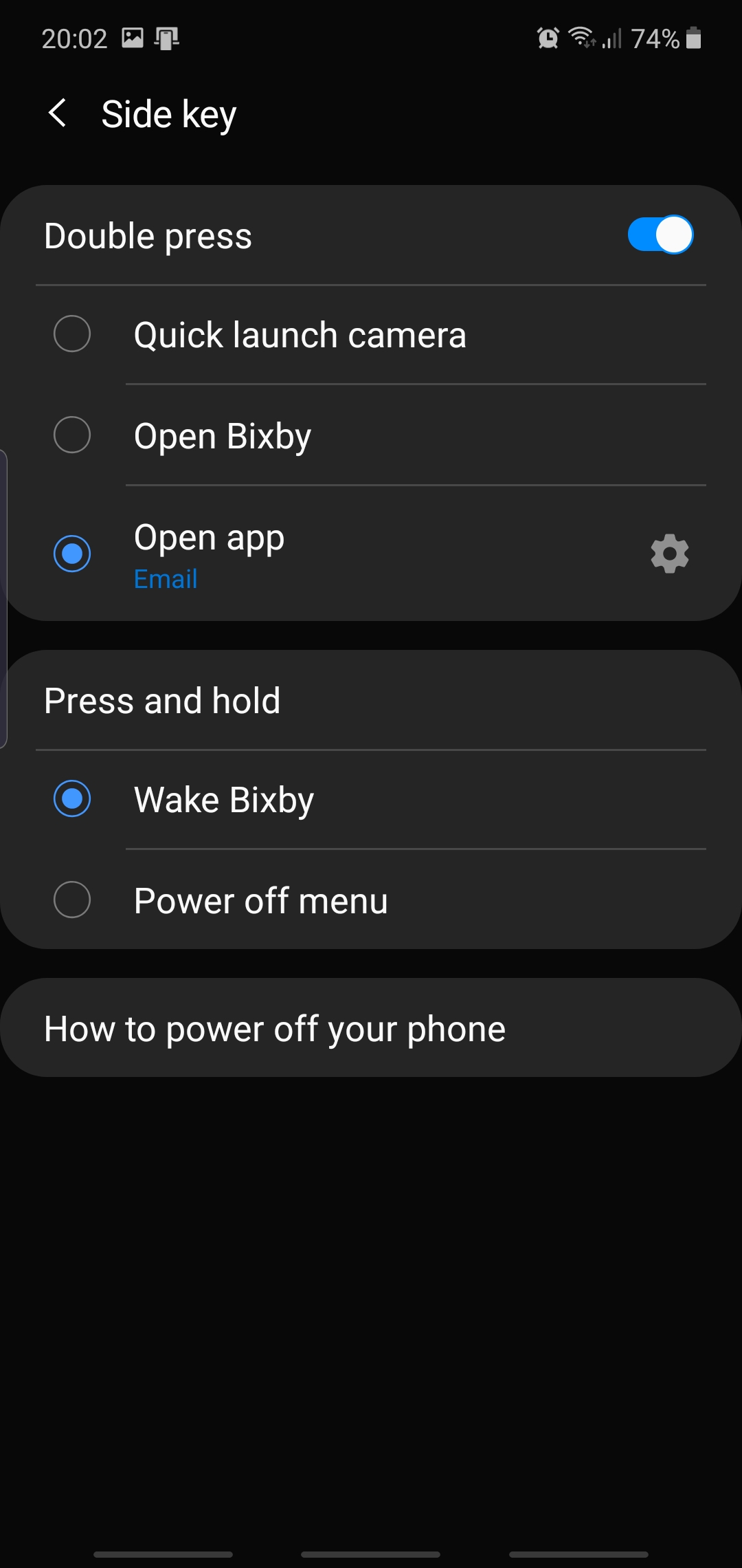 Side key is split between two main functions, namely Double press, and Press and hold. You can choose between quick launching the Camera app, launching Bixby, or opening a custom app when double-pressing the side key. Tap the cogwheel icon to select an app. Alternatively, you can tap the toggle and turn off the double-press function altogether.