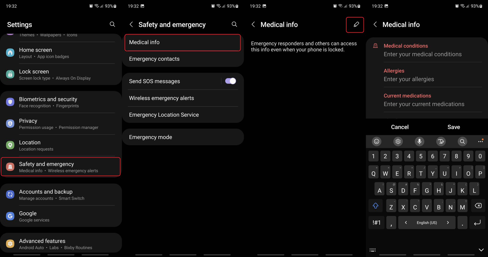 The “Medical info” tab inside the “Safety and emergency” menu lets you enter personal information such as medical conditions, allergies, current medications, blood type, and other health-related details that could be relevant in an emergency.