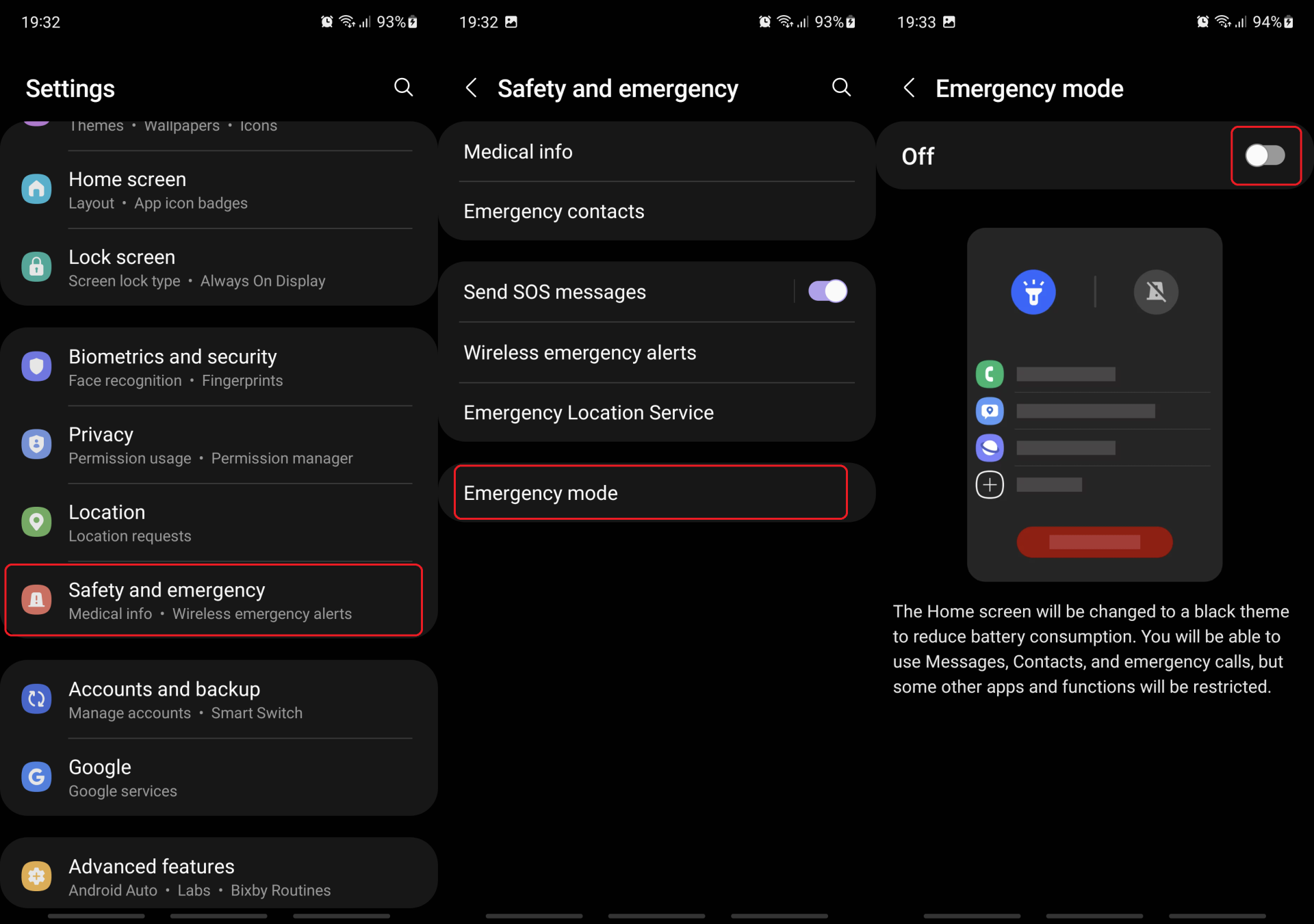 The last but not least option you'll find inside the “Safety and emergency” settings menu allows you to put your phone in “Emergency Mode.” This is an extreme battery-saving mode that disables many features and lowers your phone's CPU power draw in order to conserve energy and help you contact emergency services.