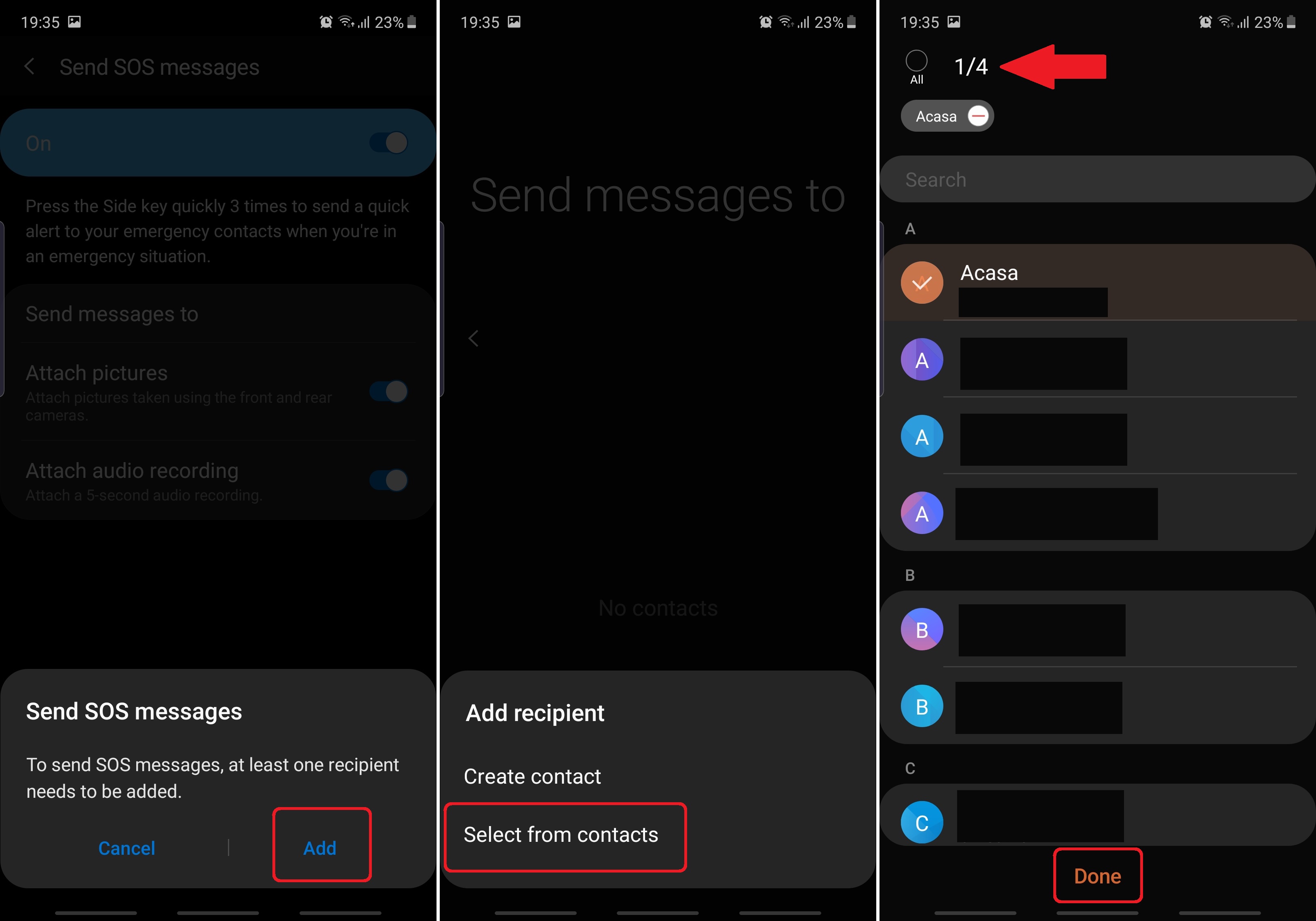 Tap Add and choose whether to Create contact or Select from contacts. (We will use the second option for this guide). Select up to four emergency contacts, tap Done, and return to the main SOS messages screen.